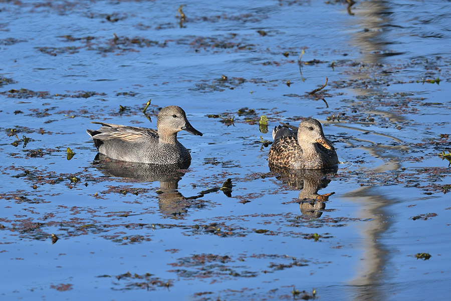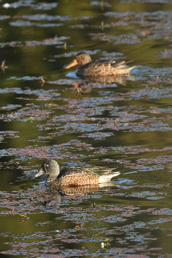 ため池にハシビロガモ。手前が雄、奥が雌。つがいかな。