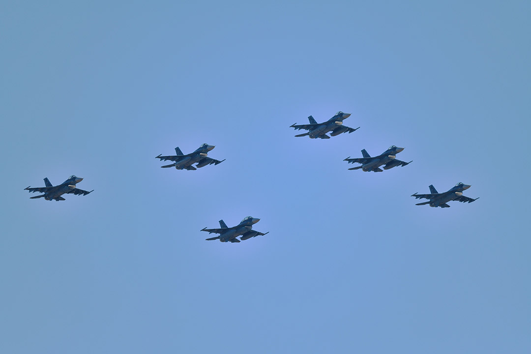 第3飛行隊のF-2戦闘機6機による、航空祭のオープニングフライトの予行飛行。