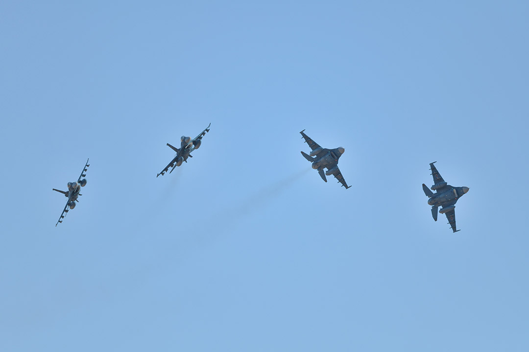 こちらはF-2戦闘機4機による AGG(対地攻撃)訓練展示の冒頭。4機「パッカン」。