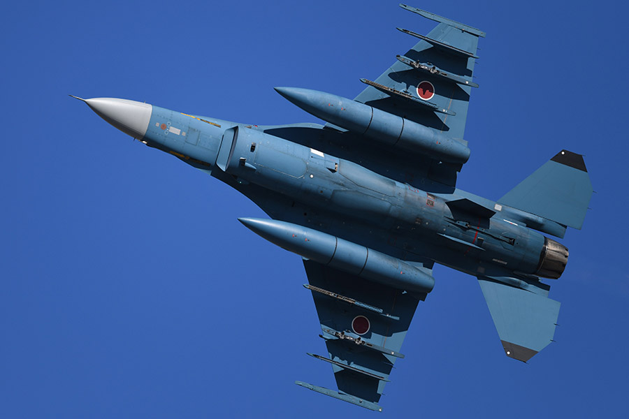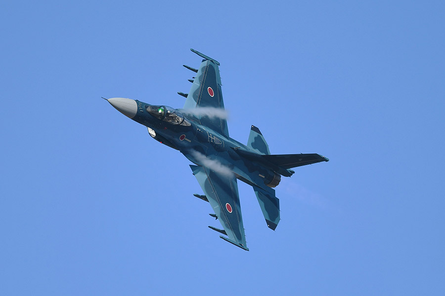 真っ青な空に青い洋上迷彩のF-2。湿度が低くてベーパーも少なめ。