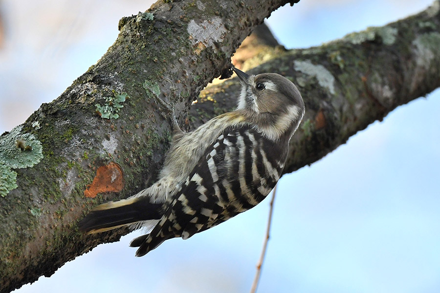 ソメイヨシノの幹にコゲラ。後頭部の赤斑が見えないので、雌かと思われます。