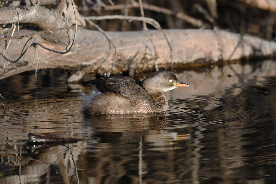 川辺にカイツブリ。25m離れた川の対岸から、太陽を背負って順光での撮影。