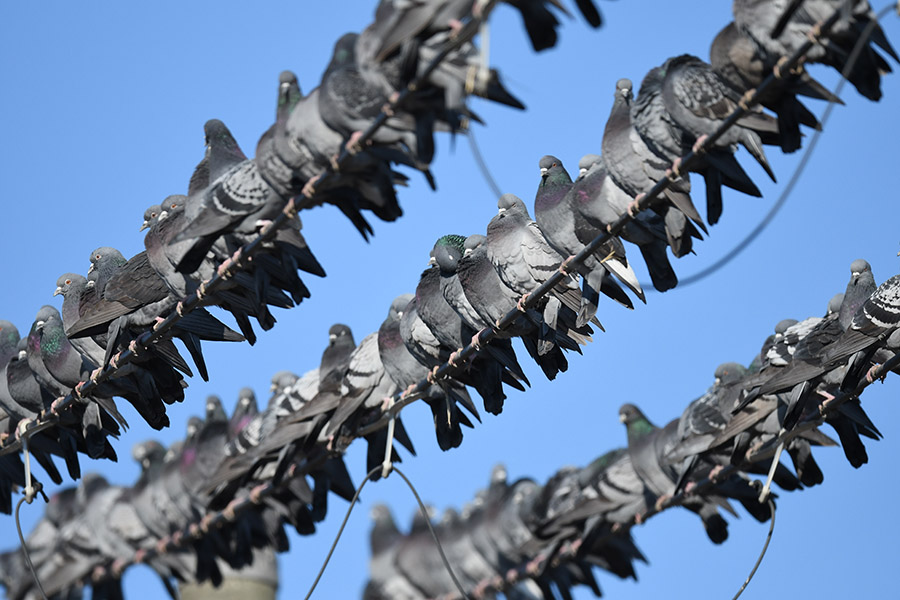 電線に止まって羽を休めるドバトたち。あまりにも大量で、ギチギチです。
