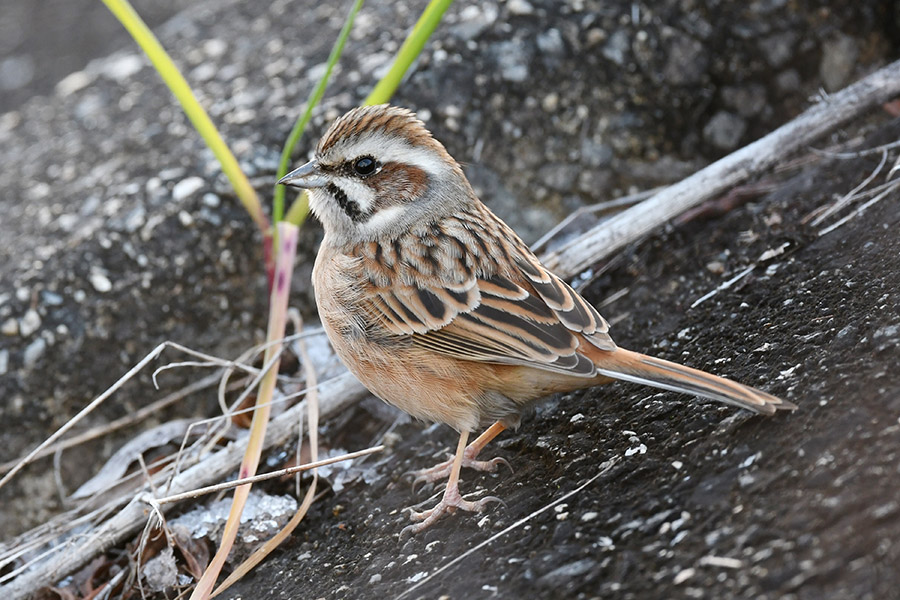 ホオジロの雌。地面をよく見ると、雪の粒が見えますね。