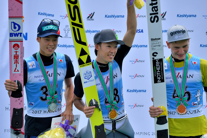 風向きの変化でまれに弱い追い風に当たる選手もいように思いますが、全般的に風の条件は穏やかでした。 この日は、優勝が小林潤志郎(雪印メグミルク)、2位が小林陵侑(土屋ホーム)と、小林兄弟がワンツーフィニッシュを成し遂げました。 兄の潤志郎は前日に続いて2連勝ですが、弟の陵侑は初日(8月25日(金))に行われた予選ラウンドを1位で通過しており、大会3日間全てで小林兄弟がトップを取ったことになります。 |