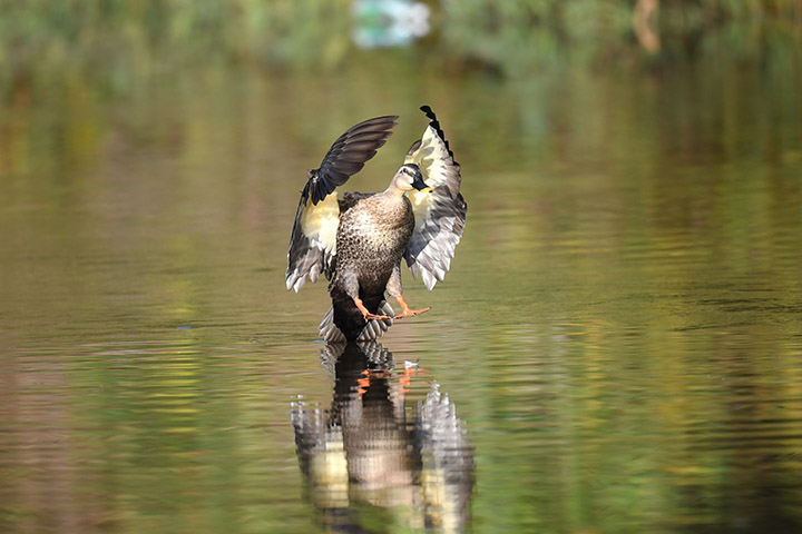 飛来したカルガモが着水するところ。シャッタータイミング的には偶然の産物。