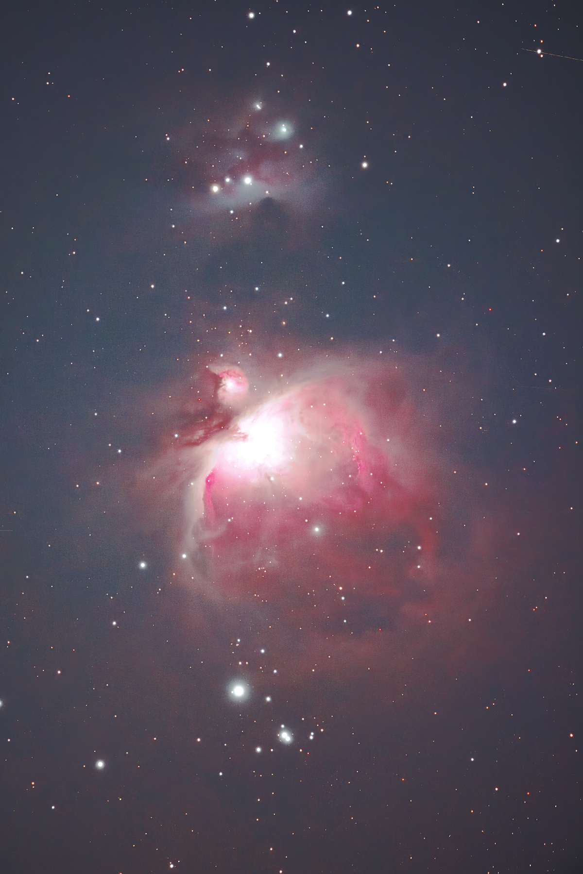 焦点距離910mmの長焦点ですので、オリオンの腰のところにある「小三つ星」が135判フルサイズの画角にちょうど収まり、この天体だけを望遠鏡で拡大して見ているイメージに近い画になります。