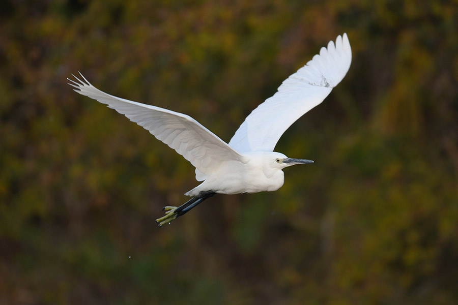 コサギが飛ぶ。1羽しか写っていませんが、10羽近くのグループで飛んできました。
