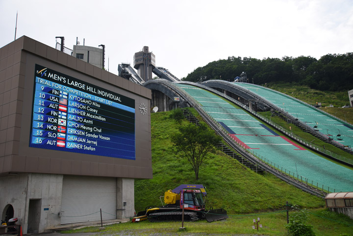 昨シーズンのワールドカップで総合優勝を果たした 小林陵侑(土屋ホーム)の実力が頭一つ以上飛び抜けていて、他の選手が使用したゲートから2段下げても飛距離はダントツ、という状況での試合でした。 今大会の海外勢はグランプリシリーズの総合成績上位3名が欠場しており、優勝争いに絡む選手は多くありませんでした。 その中でも総合成績4位だった Evgeniy Klimov (RUS) は好調で、当初3位の成績で試合を終えましたが、競技終了後のチェックでジャンプスーツの規定違反が確認され、2ndラウンドのジャンプが失格となり30位に順位を落としました。 その結果、4位だった 佐藤慧一(雪印メグミルク)が繰り上がりで3位に浮上し、日本人選手による表彰台独占が実現しました。  |